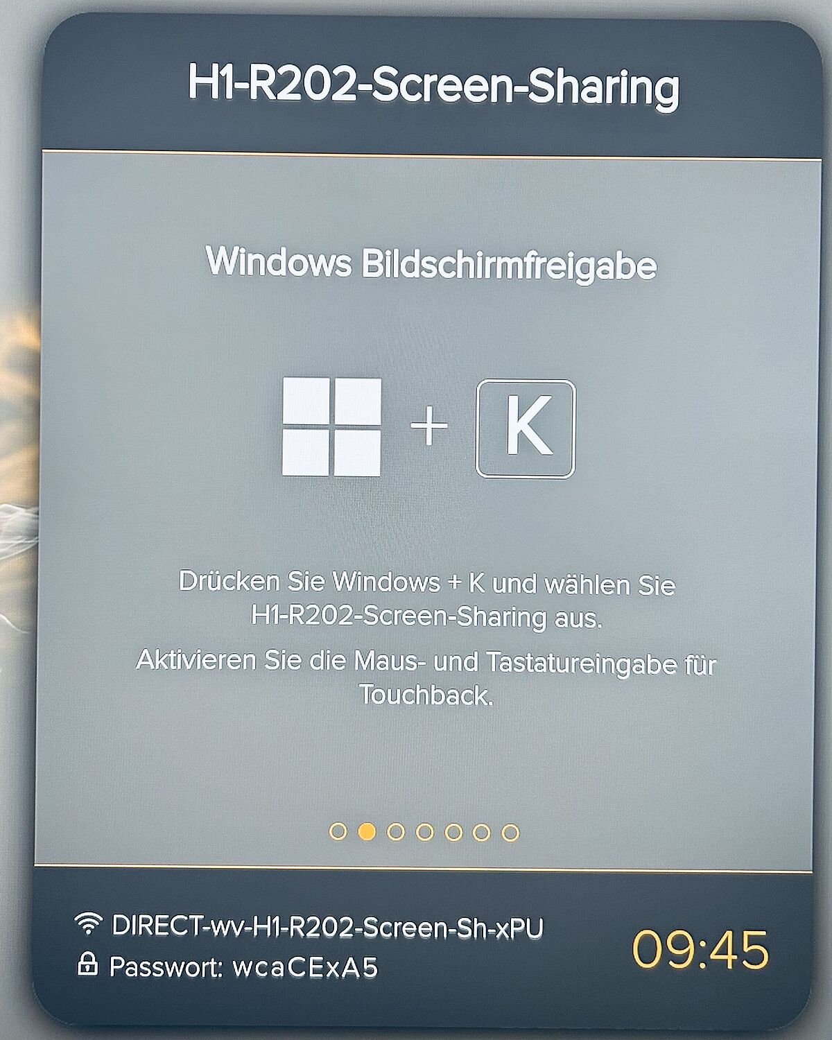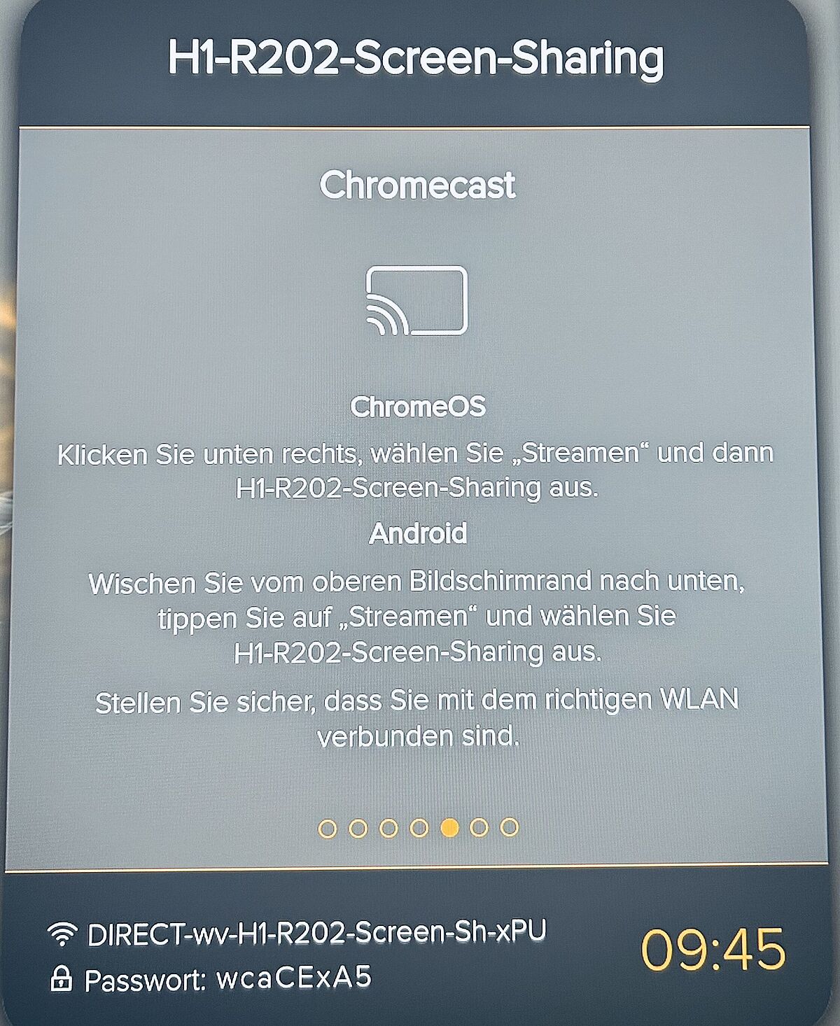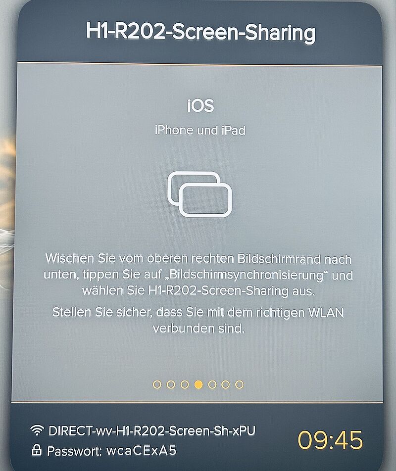 Darüber im ersten Obergeschoss befinden sich in R.201 und R.202 zwei Gruppenarbeitsräume mit verschiedenen Einrichtungen. Beide Räume sind mit modernen Monitoren ausgestattet, mit denen Sie den Bildschirm ihres eigenes Gerätes über WLAN anzeigen können. Diese bedienen Sie wie folgt: