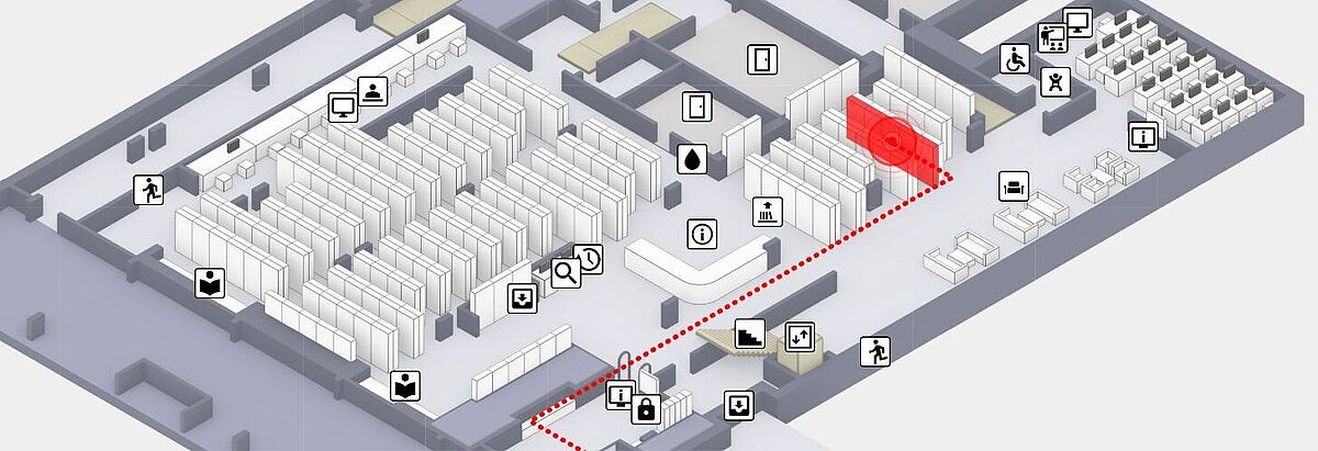 TIPP: Über die rechte Maustaste können Sie einen beliebigen Startpunkt auf dem Plan wählen und dann mit der Suche zum gesuchten Ort oder Regal navigieren.