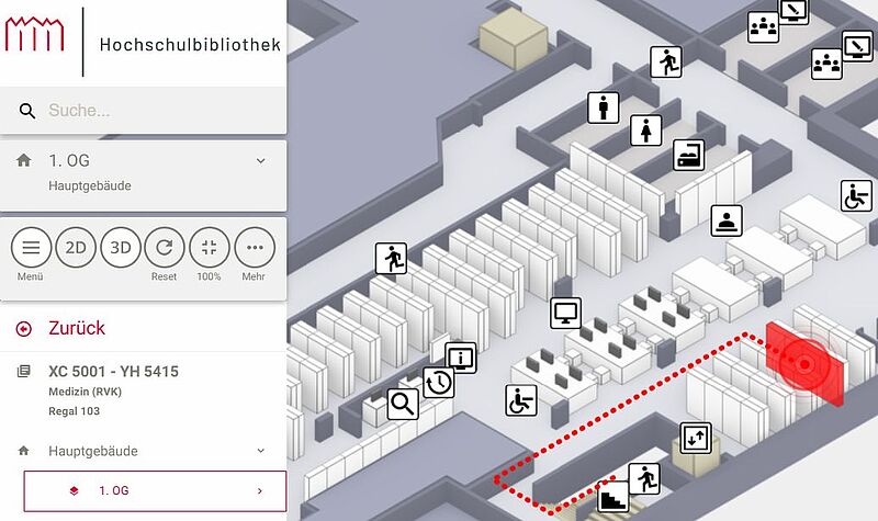 Wenn Sie ein Buch im Bibliothekskatalog oder Discovery finden, ist über die Standortanzeige unten bei den Angaben zum Exemplar der Standort zu finden. Sie können sich hier ein Beispiel in den RVK-Gruppen ansehen. Im Plan ist das Regal rot markiert und hat eine Nummer, diese merken Sie sich. Die Regale sind vor Ort entsprechend mit den Nummern beschriftet.