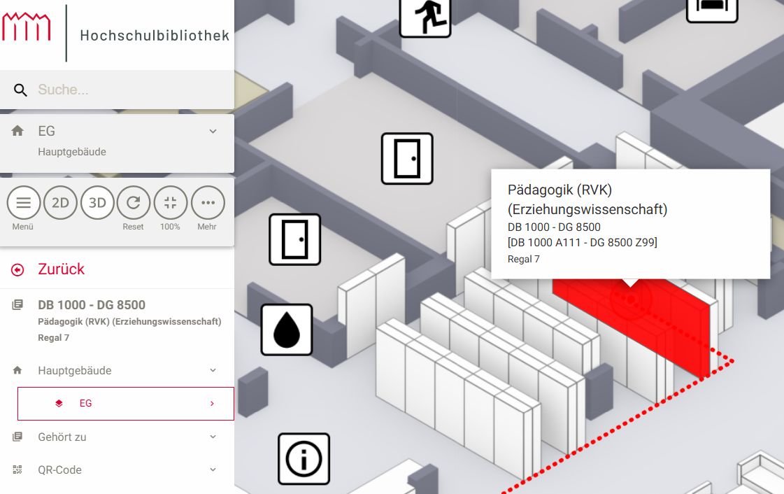 Wenn Sie ein Buch im Bibliothekskatalog oder Discovery finden, ist über die Standortanzeige unten bei den Angaben zum Exemplar der Standort zu finden. Sie können sich hier ein Beispiel in den RVK-Gruppen ansehen. Im Plan ist das Regal rot markiert und hat eine Nummer, diese merken Sie sich. Die Regale sind vor Ort entsprechend mit den Nummern beschriftet.