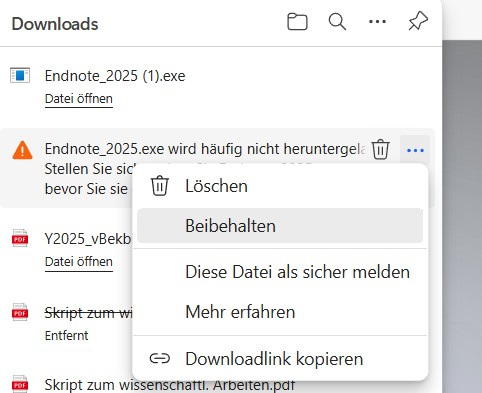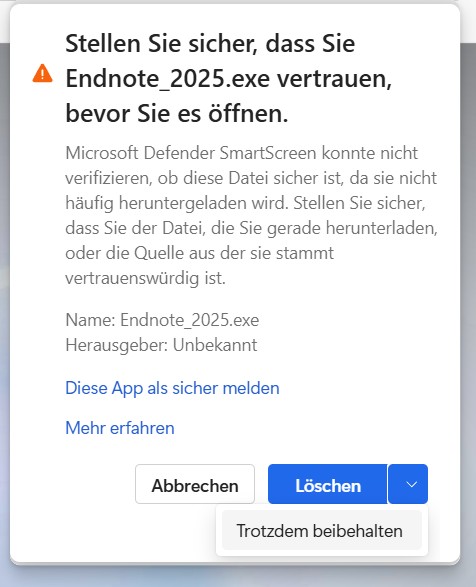 Beachten Sie noch unseren Hinweis, dass ggf durch den Windows Defender im Browser das Herunterladen der Installtionsdatei blockiert wird, hier müssen Sie im Download-Menü des Browsers die Datei “beibehalten”.