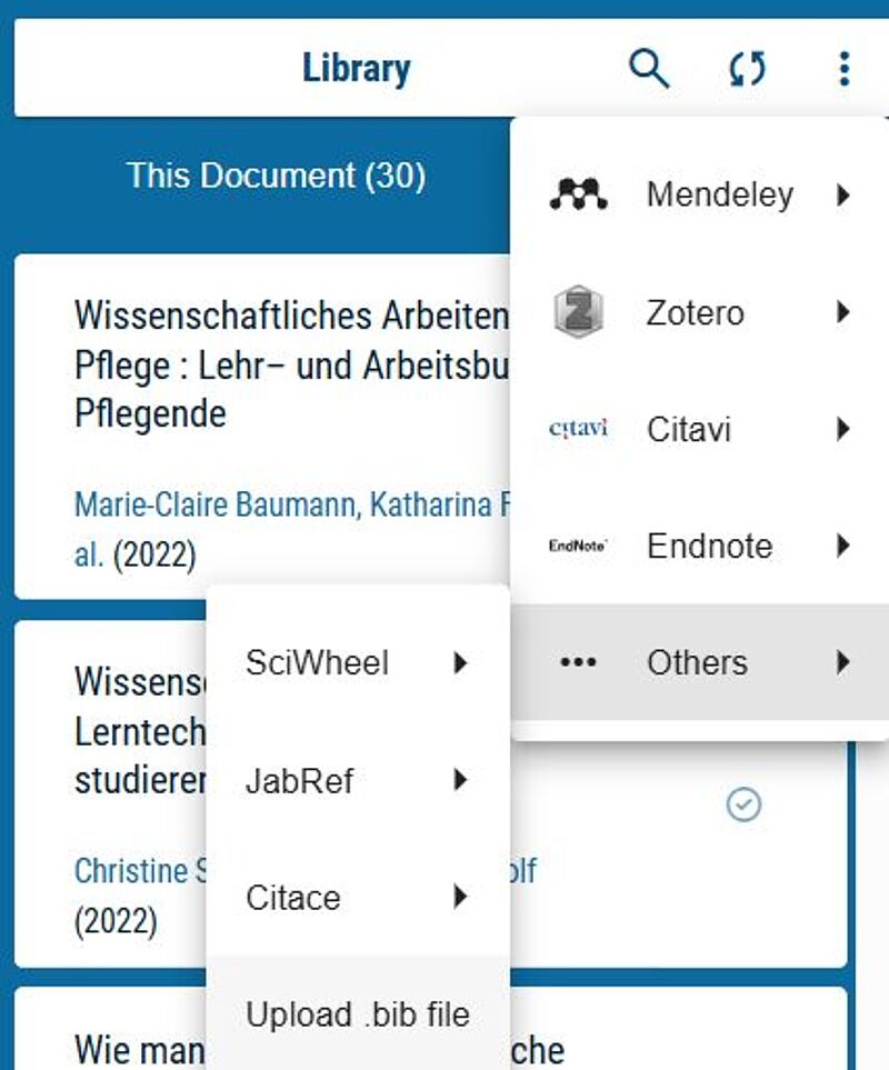 Wenn Sie mit Endnote oder einer anderen Software Ihre Quellen sammeln, können Sie diese in die Sciflow-Library importieren und als Zitat in den Text einfügen. Schnittstellen für den direkten Import hat SciFlow für Mendeley, Zotero und Citavi.