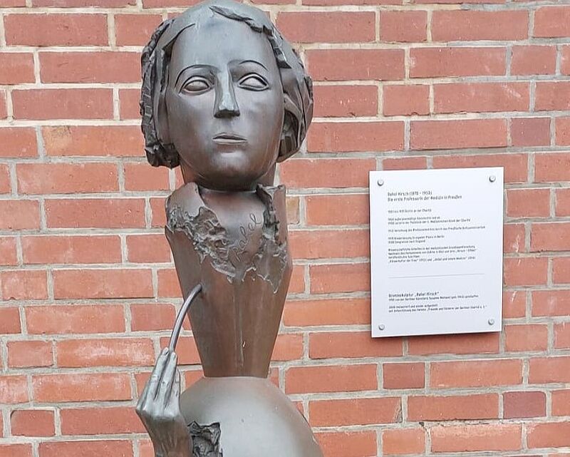 Eine Wegbegleiterin der modernen Medizin wird auf dem Gelände durch eine Plastik geehrt. Im Jahr 1913 wurde Rahel Hirsch als erster Frau im Königreich Preußen ein Professorentitel in Medizin verliehen – ein Meilenstein in der akademischen Geschichte. Ihre Laufbahn wurde 1938 durch das nationalsozialistische Regime abrupt beendet: Ihre Approbation wurde entzogen, sie musste Deutschland verlassen und emigrierte nach England. Dieses Denkmal steht sinnbildlich für die Brüche in der Wissenschaftsgeschichte und mahnt zur Auseinandersetzung mit gesellschaftlicher Verantwortung und Erinnerungskultur.
