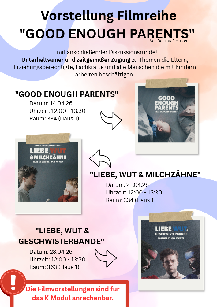 - Film 1 - GOOD ENOUGH PARENTS - Datum: 14.04.26 / Uhrzeit: 12:00 - 13:30 / Raum: 334 (Haus 1)
