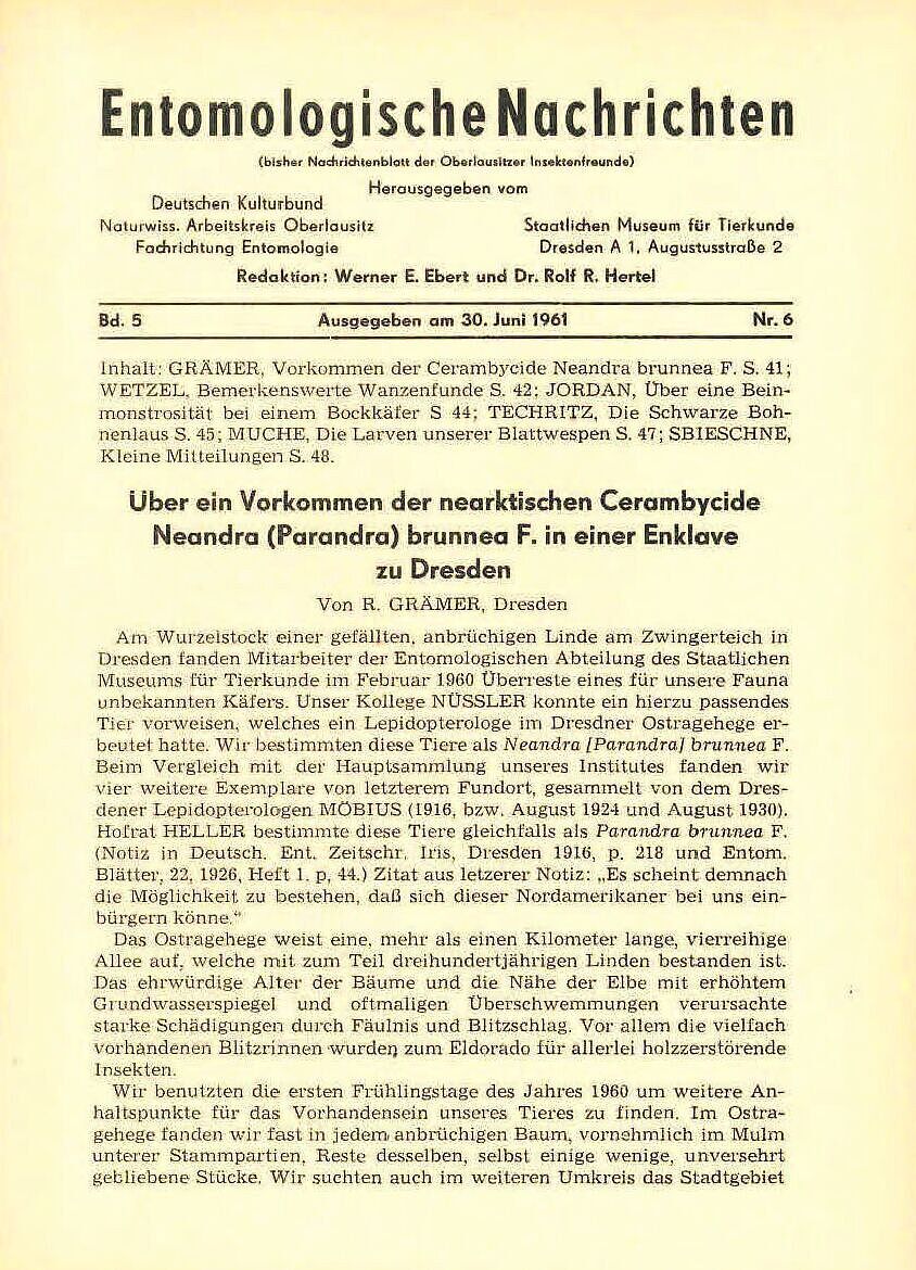Herausgegeben vom Staatlichen Museum für Tierkunde Dresden und vom Naturwissenschaftlichen Arbeitskreis Oberlausitz, Fachrichtung Entomologie (ab 5/1969 dem Kulturbund untergliedert, ab 1964 umbenannt in Bezirksfachausschuss Entomologie Dresden), ab 7+8/1969 nur noch herausgegeben von letzterem