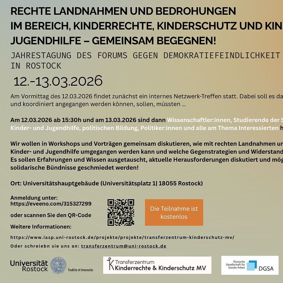 Am 12. und 13. März 2026 fand an der Universität Rostock die Jahrestagung des "Forums gegen Demokratiefeindlichkeit und rechte Landnahme in der Sozialen Arbeit" statt. Die Veranstaltung wurde von Maike Nadar und Anna Bahr vom Transferzentrum Kinderschutz und Kinderrechte Mecklenburg-Vorpommern ausgerichtet und brachte Fachkräfte, Wissenschaftler:innen sowie zivilgesellschaftliche Akteur:innen aus der Sozialen Arbeit und Sozialpädagogik zusammen, um aktuelle Entwicklungen und Herausforderungen…