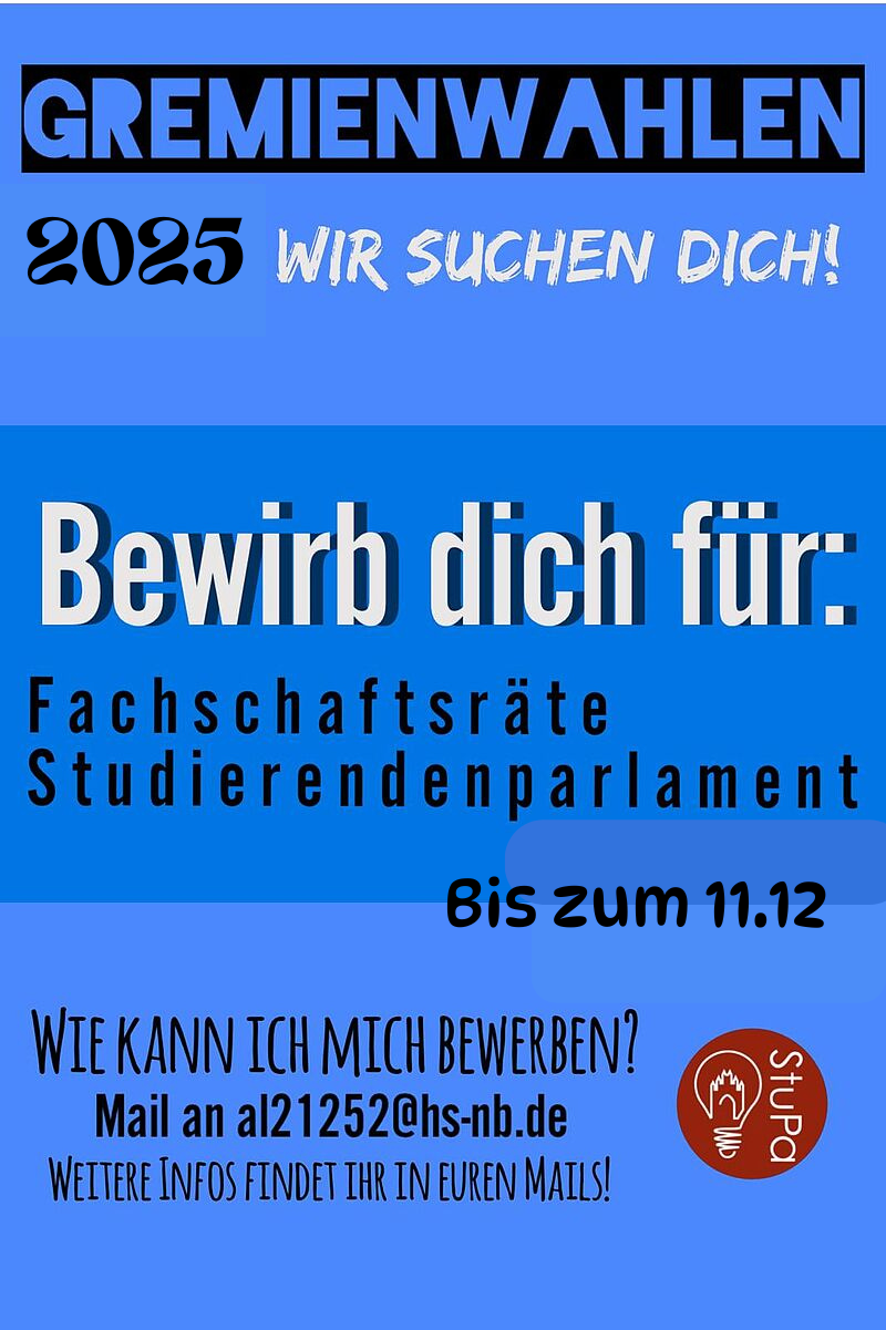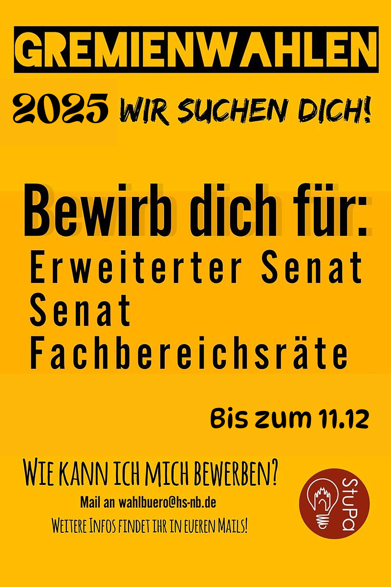 Bei diesen Gremien haben wir Studierende die Möglichkeit Plätze im erweiterten Senat, Senat und Fachbereichsrat der Fachbereich zu bestzten. Dies ist gerade wichtig um in den genannten Gremien eine studentische Stimme zu haben und Entscheidungen mit zu beeinflussen und abzustimmen. Bewerbt euch bis zum 12.12.2025 auf diese Posten, um unserer Studierendenschaft eine Stimme zu geben!