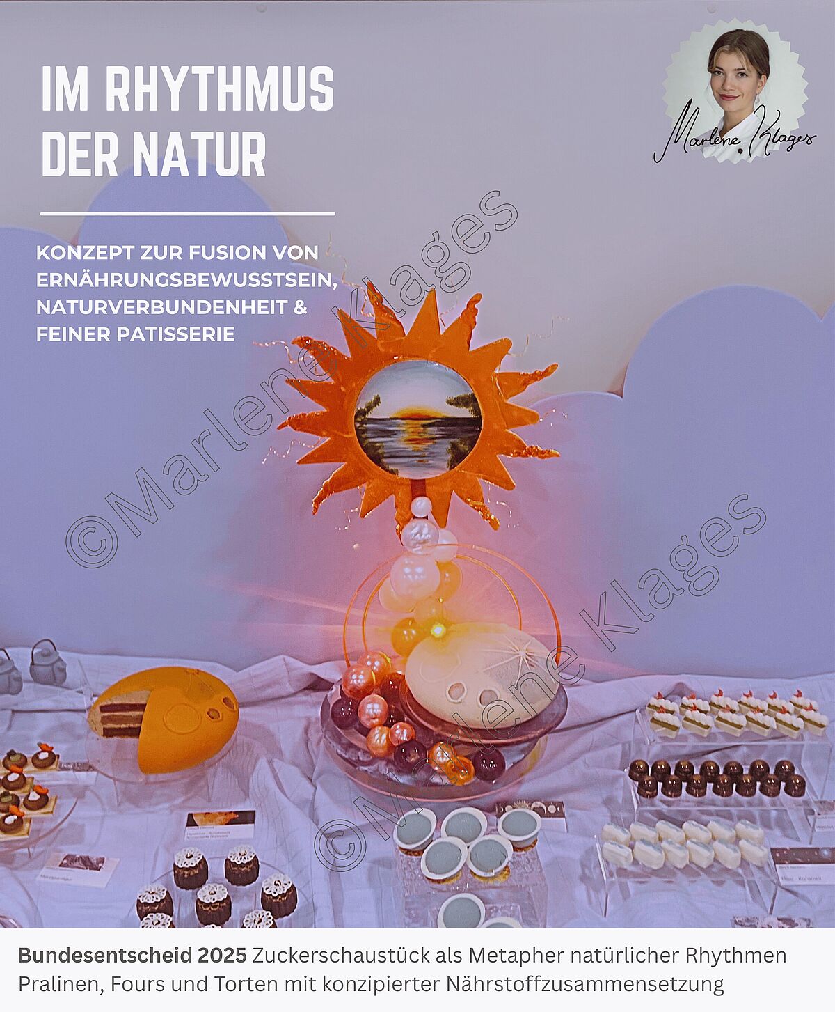 Unter dem Leitmotiv „Im Rhythmus der Natur“ präsentierte sie ihr Konzept bei der Deutschen Meisterschaft im Konditorenhandwerk 2025 und setzte bundesweit Impulse für eine verantwortungsbewusste, ganzheitliche Konditorei.