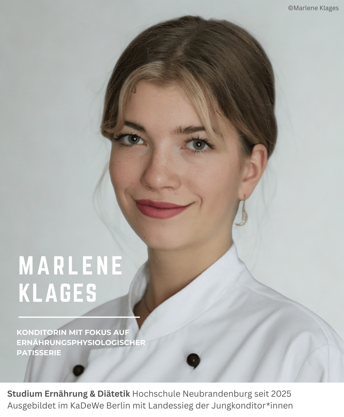 Seit Herbst 2025 studiert Marlene Klages Ernährung und Diätetik an der HSNB. Die mehrfach ausgezeichnete Konditorin – unter anderem Landessiegerin der Jungkonditorinnen und Jungkonditoren Berlin – bringt handwerkliche Exzellenz, künstlerisches Talent und nachhaltiges Denken in den Studiengang ein.