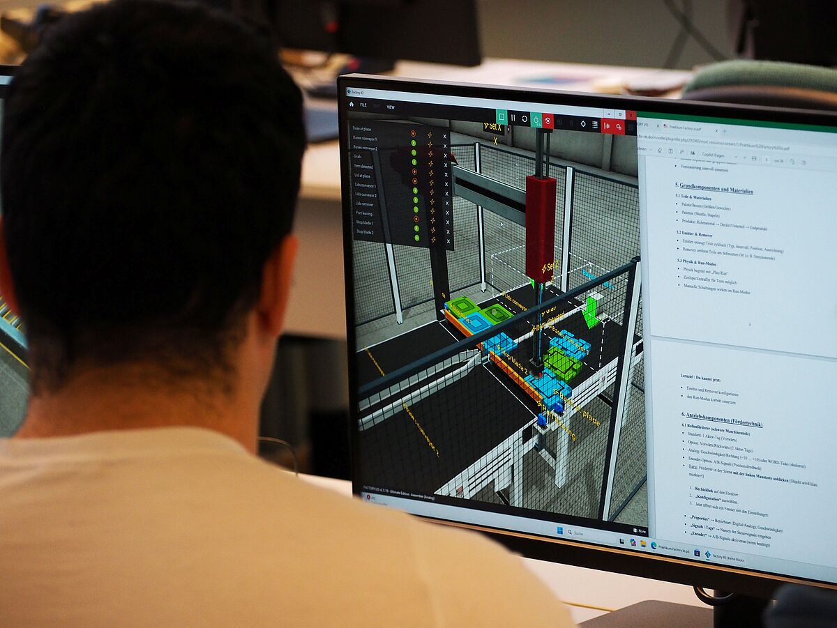 Mit der 3D-Simulationsumgebung „Factory I/O“ werden intralogistische Planungen und Verpackungsprozesse zunächst digital entworfen, KI-gestützt analysiert und anschließend per SPS (Speicherprogrammierbare Steuerung) direkt in reale Anlagen überführt. Ein neu angeschaffter 4-Achs-Roboter bildet dabei die praxisnahe Brücke zwischen digitalem Zwilling und physischer Station.