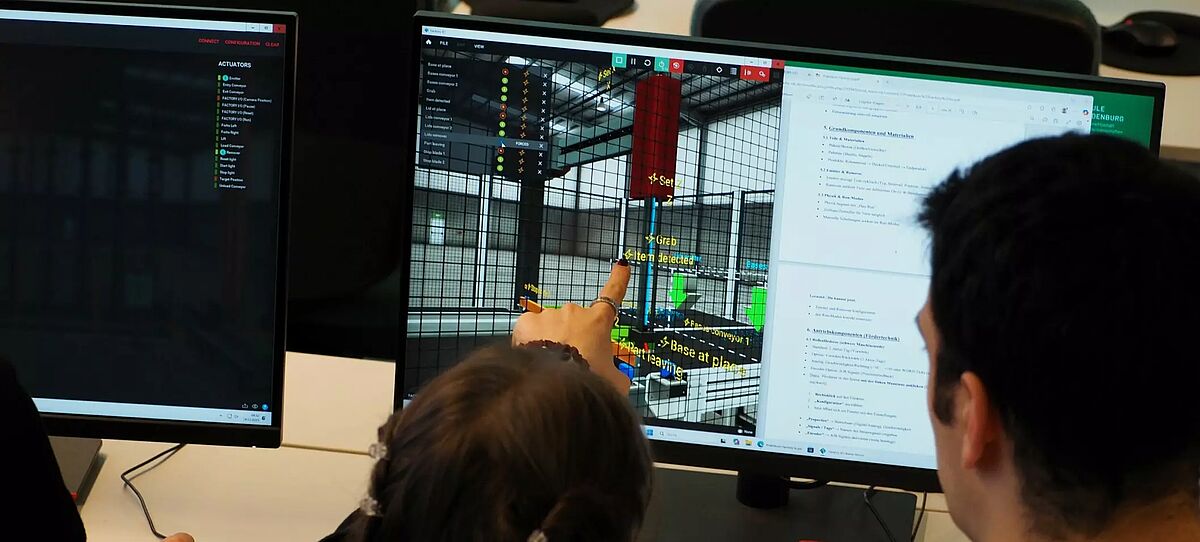 Mithilfe von digitalen Zwillingen können Studierende mit modernster digitaler Technik reale Wertschöpfungsketten nachbilden und erproben. Die Studierenden von Prof. Dr. Scheuerle nehmen in seiner Lehre Transportlinien virtuell in Betrieb. Bei der Planung und Vorbereitung dieses neuen didaktischen Ansatzes wurde Prof. Dr. Scheuerle von unserem Master-Studierenden Fridolin Lüdemann maßgeblich unterstützt. Prof Dr. Herlat Schöne war im Rahmen seines Moduls Automatisierungstechnik an der Konzeptionierung und Umsetzung beteiligt.